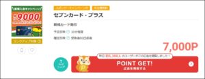 ポイントサイトのモッピーで年会費無料の「セブンカードプラス」の発行が7,000pt(7,000円相当)になっています。そしてさらにカード会社側のキャンペーンで最大9,000円、モッピーの入会ボーナスで2,000円相当なので合計すると…