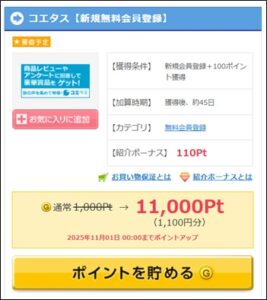 新規会員登録後、30日以内にコエタスポイントを100ポイント獲得完了でポイント加算対象となります。