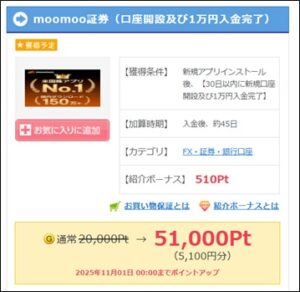 ポイントサイトのgetmoneyでmoomoo証券が51,000pt(5,100円相当)の大還元になっています。moomoo証券の口座開設は1万円の入金こそ必要ですが、、
