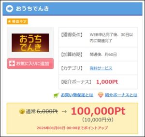 ポイントサイトのゲットマネー(げっとま)でおうちでんきが100,000pt(10,000円)の還元になっています。