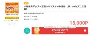 ポイントサイトのモッピーで三菱UFJ eスマート証券(旧:auカブコム証券)が15,000pt(15,000円相当)の大還元になっています。この案件は少し前から高騰していましたが、ここにきて過去最高ポイントになりました。