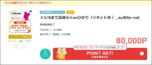 ポイントサイトのモッピーでauひかり(ソネット光 )_au光So-netが80,000pt(80,000円)の還元になっています。