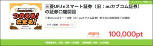 ポイントサイトのPOWLで三菱UFJ eスマート証券(旧:auカブコム証券)が100,000pt(10,000円相当)の大還元になっています。この案件は少し前から高騰していましたが、ここにきて過去最高ポイントになりました。