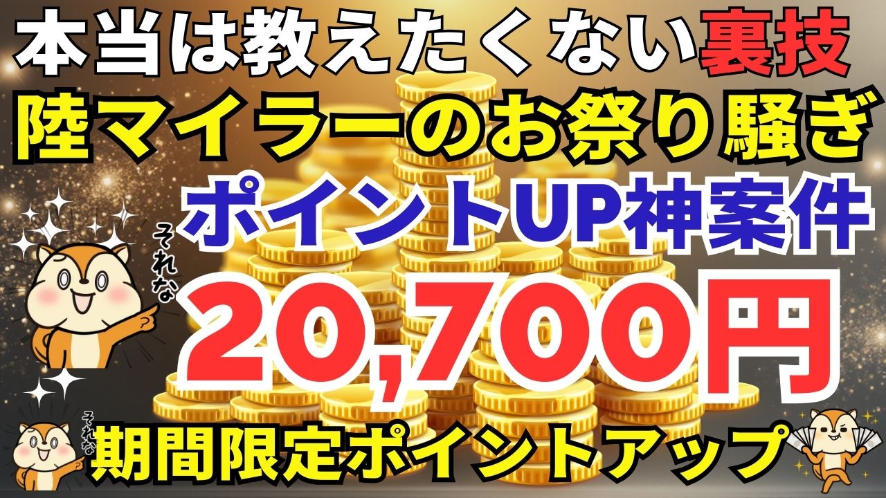 年会費永年無料の人気カードでこれだけもらえるとは、まさに陸マイラー祭りと言えるでしょう。ただしポイントアップは期間限定ですのでお早目にご利用ください。